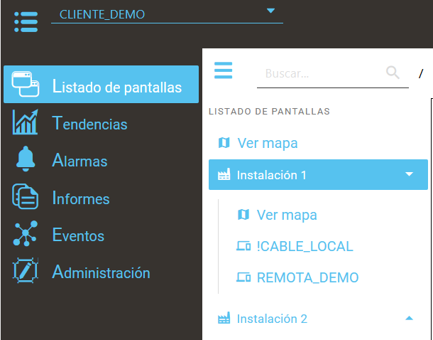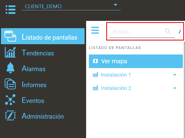 Al desplegar la vista Listado de pantallas, se encuentran las instalaciones del cliente y una barra de búsqueda para acceder rápidamente a una instalación o dispositivo.