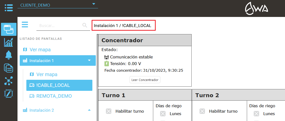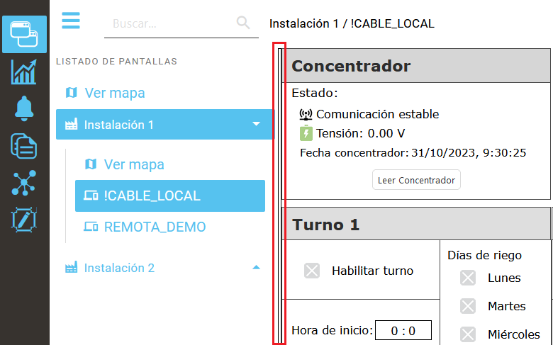 Una vez seleccionado un dispositivo de una de las instalaciones, por ejemplo, el concentrador !CABLE_LOCAL aparece una pantalla con una serie de datos comentados más adelante. Destacar que, a la derecha de la barra de búsqueda, esta la ruta desde la pantalla de inicio hasta la pantalla del concentrador !CABLE_LOCAL, de esta manera, siempre se tiene a la vista que pantalla se está consultando o modificando.