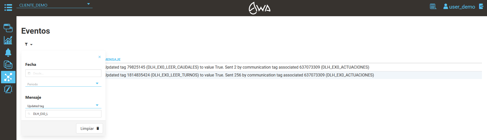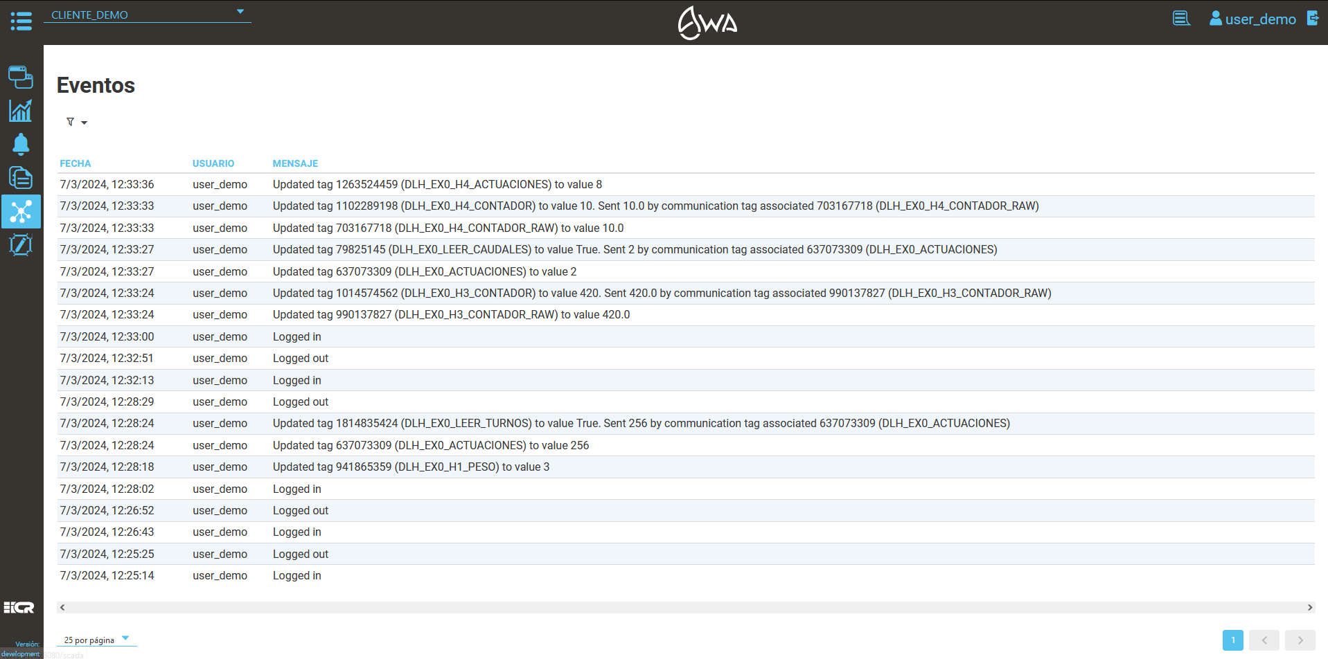 Desde la barra de navegación se puede llegar a la vista de Eventos. Esta vista permite obtener información sobre eventos que se producen en la plataforma como son iniciar sesión, cerrar sesión y establecer el valor de un tag. Aparecen transcurrido un breve periodo de tiempo.
