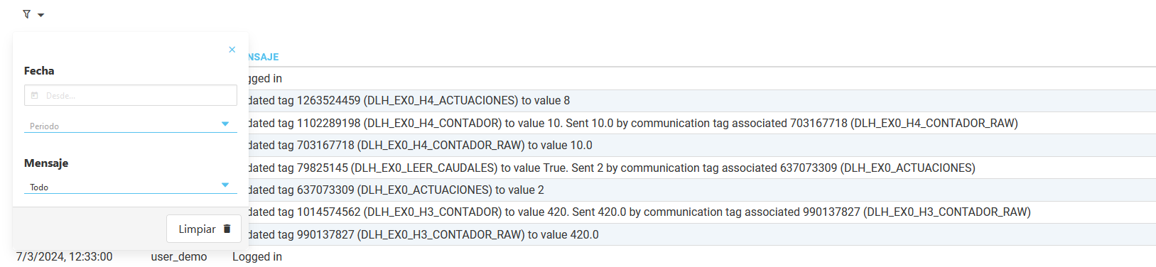 En la parte superior de la vista se puede ver un icono de Filtros para hacer la búsqueda más sencilla, los filtros disponibles son filtrado por fecha, usuario (si se disponen de los permisos necesarios) y mensaje. Además, los eventos se puede ordenar por fecha en orden ascendente o descendente.