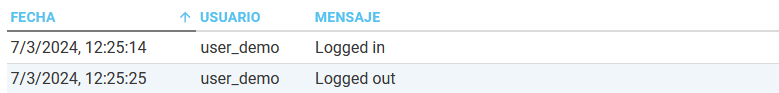 Como se muestra en la Ilustración 109 se registra la fecha en la que se produce el evento, qué usuario lo ha llevado a cabo y el tipo.